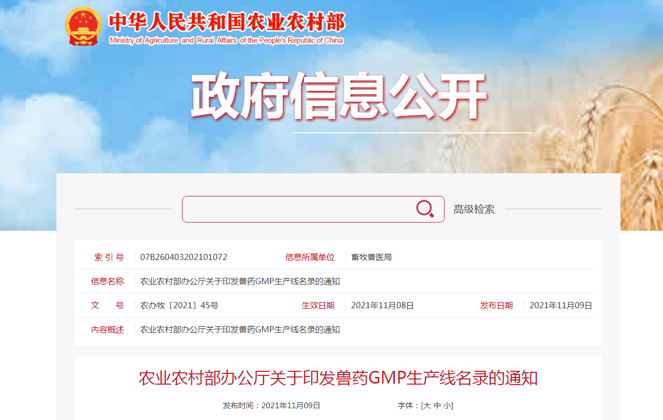 農(nóng)業(yè)農(nóng)村部辦公廳關(guān)于印發(fā)獸藥GMP生產(chǎn)線名錄的通知 各省、自治區(qū)、直轄市農(nóng)業(yè)(農(nóng)牧)、畜牧獸醫(yī)廳(局、委),新疆生產(chǎn)建設(shè)兵團農(nóng)業(yè)農(nóng)村局: 為貫徹落實《獸藥生產(chǎn)質(zhì)量管理