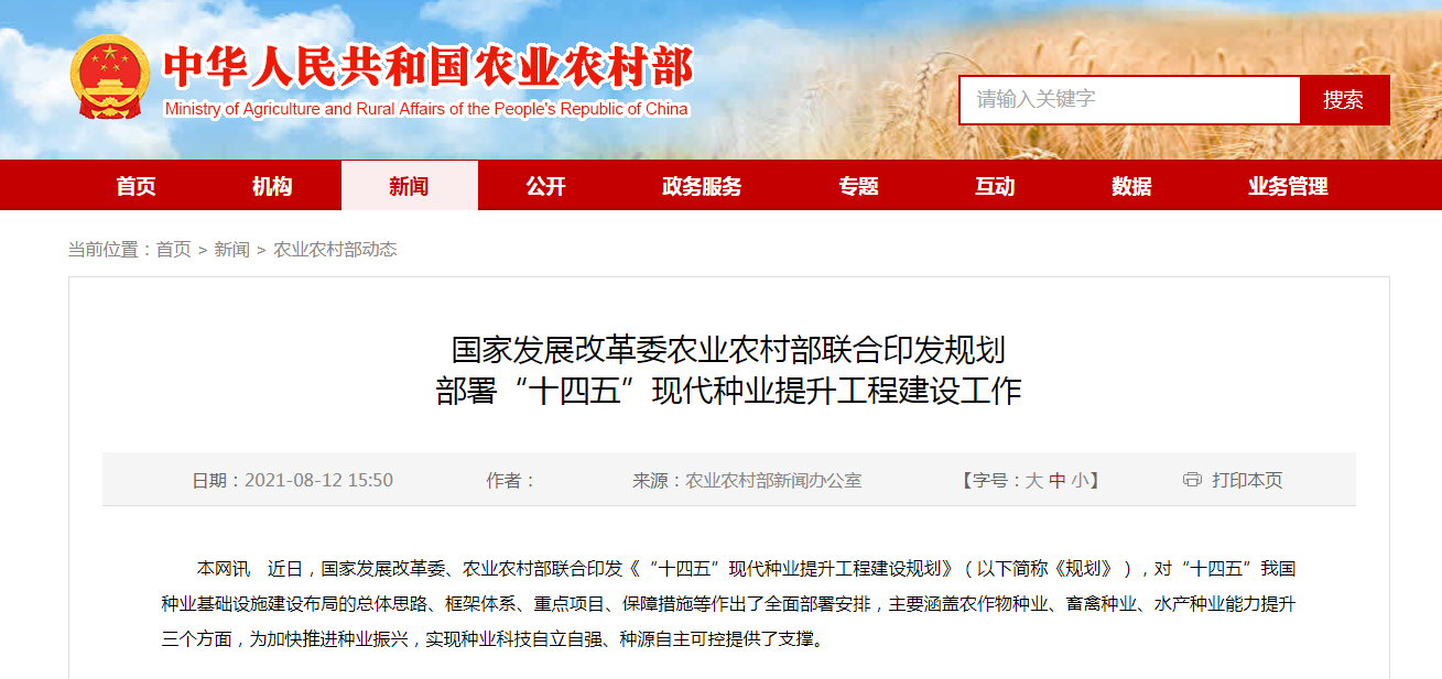 近日,國家發(fā)展改革委、農(nóng)業(yè)農(nóng)村部聯(lián)合印發(fā)《“十四五”現(xiàn)代種業(yè)提升工程建設(shè)規(guī)劃》(以下簡稱《規(guī)劃》),對(duì)“十四五”我國種業(yè)基礎(chǔ)設(shè)施建設(shè)布局的總
