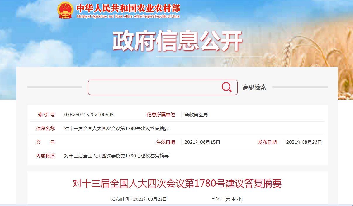 對(duì)十三屆全國人大四次會(huì)議第1780號(hào)建議答復(fù)摘要 農(nóng)業(yè)農(nóng)村部高度重視獸用疫苗生產(chǎn)企業(yè)生物安全管理,制定出臺(tái)了《口蹄疫、高致病性禽流感疫苗生產(chǎn)企業(yè)設(shè)置規(guī)劃》和《獸用