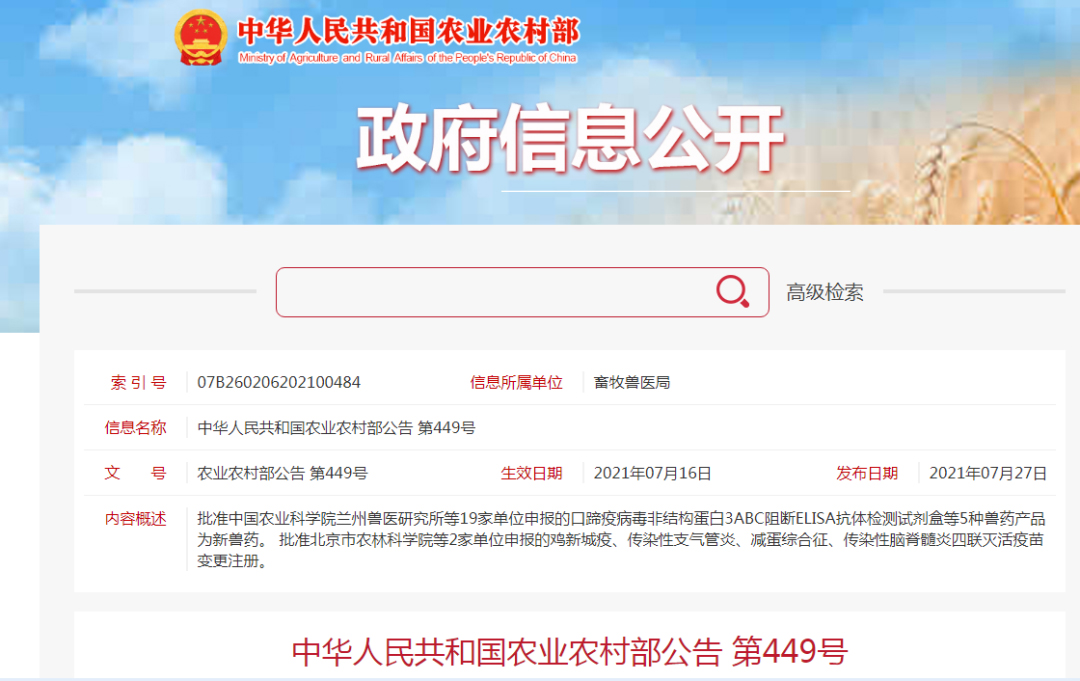 中華人民共和國農(nóng)業(yè)農(nóng)村部公告 第449號農(nóng)業(yè)農(nóng)村部畜牧獸醫(yī)局 根據(jù)《獸藥管理條例》和《獸藥注冊辦法》規(guī)定,經(jīng)審查,批準中國農(nóng)業(yè)科學院蘭州獸醫(yī)研究所等19家單位申報的口