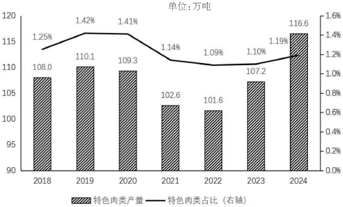 根據(jù)國家統(tǒng)計局公布的肉類產(chǎn)量和豬牛羊禽肉產(chǎn)量數(shù)據(jù)計算,2024年我國特色肉類產(chǎn)量116.6萬噸,占肉類總產(chǎn)量的1.19%。從產(chǎn)量規(guī)模來看,特色肉類在我國肉類供給體系中仍處于補充地位,占比顯著低于大宗肉類。